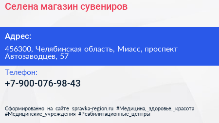 Селена, магазин сувениров по адресу 456300, Челябинская область, Миасс, проспект Автозаводцев, 57 в дальнейшем Организация, размещена в следующих категориях: