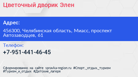 Цветочный дворик Элен по адресу 456300, Челябинская область, Миасс, проспект Автозаводцев, 61 в дальнейшем Организация, размещена в следующих категориях: