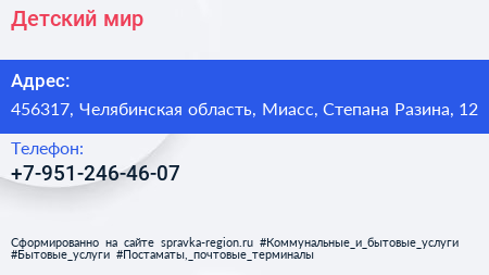 Детский мир по адресу 456317, Челябинская область, Миасс, Степана Разина, 12 в дальнейшем Организация, размещена в следующих категориях: