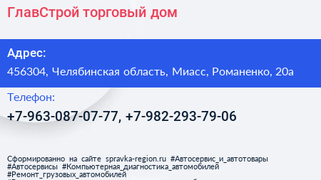 ГлавСтрой, торговый дом по адресу 456304, Челябинская область, Миасс, Романенко, 20а в дальнейшем Организация, размещена в следующих категориях: