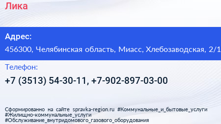 Лика по адресу 456300, Челябинская область, Миасс, Хлебозаводская, 2/1 в дальнейшем Организация, размещена в следующих категориях: