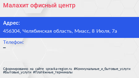 Малахит, офисный центр по адресу 456304, Челябинская область, Миасс, 8 Июля, 7а в дальнейшем Организация, размещена в следующих категориях: