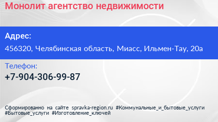Монолит, агентство недвижимости по адресу 456320, Челябинская область, Миасс, Ильмен-Тау, 20а в дальнейшем Организация, размещена в следующих категориях: