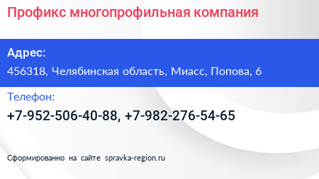 Профикс, многопрофильная компания по адресу 456318, Челябинская область, Миасс, Попова, 6 в дальнейшем Организация, размещена в следующих категориях: