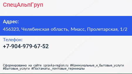 СпецАльпГруп по адресу 456323, Челябинская область, Миасс, Пролетарская, 1/2 в дальнейшем Организация, размещена в следующих категориях: