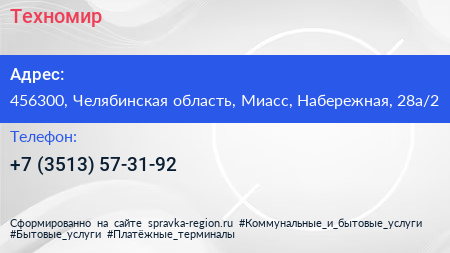 Техномир по адресу 456300, Челябинская область, Миасс, Набережная, 28а/2 в дальнейшем Организация, размещена в следующих категориях: