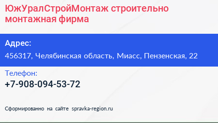 ЮжУралСтройМонтаж, строительно-монтажная фирма по адресу 456317, Челябинская область, Миасс, Пензенская, 22 в дальнейшем Организация, размещена в следующих категориях: