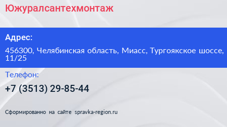 Южуралсантехмонтаж по адресу 456300, Челябинская область, Миасс, Тургоякское шоссе, 11/25 в дальнейшем Организация, размещена в следующих категориях: