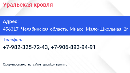 Уральская кровля по адресу 456317, Челябинская область, Миасс, Мало-Школьная, 2г в дальнейшем Организация, размещена в следующих категориях: