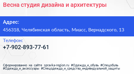 Весна, студия дизайна и архитектуры по адресу 456318, Челябинская область, Миасс, Вернадского, 13 в дальнейшем Организация, размещена в следующих категориях:
