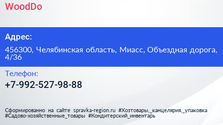 WoodDo по адресу 456300, Челябинская область, Миасс, Объездная дорога, 4/36 в дальнейшем Организация, размещена в следующих категориях: