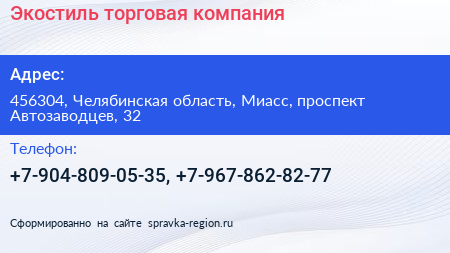 Экостиль, торговая компания по адресу 456304, Челябинская область, Миасс, проспект Автозаводцев, 32 в дальнейшем Организация, размещена в следующих категориях: