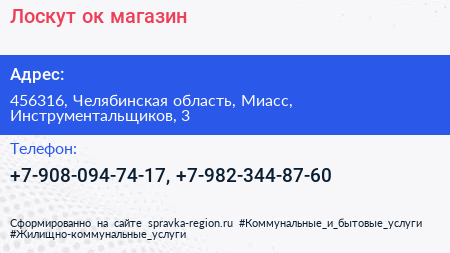 Лоскут`ок, магазин по адресу 456316, Челябинская область, Миасс, Инструментальщиков, 3 в дальнейшем Организация, размещена в следующих категориях:
