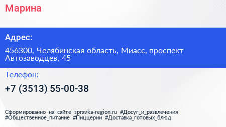 Марина по адресу 456300, Челябинская область, Миасс, проспект Автозаводцев, 45 в дальнейшем Организация, размещена в следующих категориях: