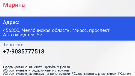 Марина по адресу 456300, Челябинская область, Миасс, проспект Автозаводцев, 57 в дальнейшем Организация, размещена в следующих категориях: