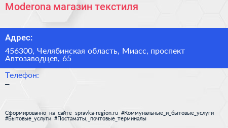 Moderona, магазин текстиля по адресу 456300, Челябинская область, Миасс, проспект Автозаводцев, 65 в дальнейшем Организация, размещена в следующих категориях: