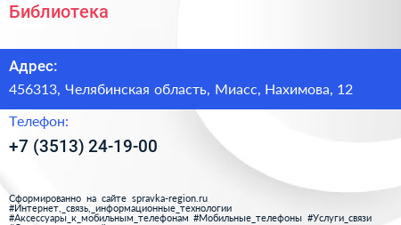 Библиотека по адресу 456313, Челябинская область, Миасс, Нахимова, 12 в дальнейшем Организация, размещена в следующих категориях: