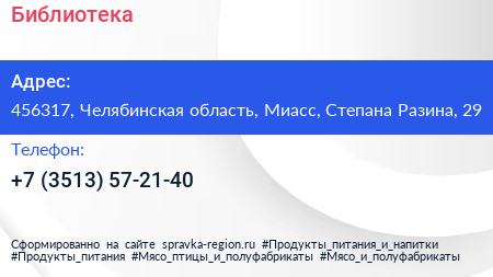 Библиотека по адресу 456317, Челябинская область, Миасс, Степана Разина, 29 в дальнейшем Организация, размещена в следующих категориях: