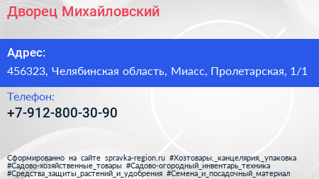 Дворец Михайловский по адресу 456323, Челябинская область, Миасс, Пролетарская, 1/1 в дальнейшем Организация, размещена в следующих категориях: