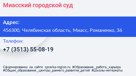 Миасский городской суд по адресу 456300, Челябинская область, Миасс, Романенко, 36 в дальнейшем Организация, размещена в следующих категориях: