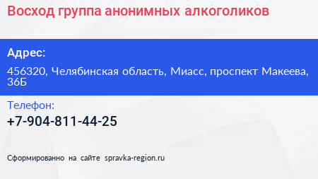 Восход, группа анонимных алкоголиков по адресу 456320, Челябинская область, Миасс, проспект Макеева, 36Б в дальнейшем Организация, размещена в следующих категориях: