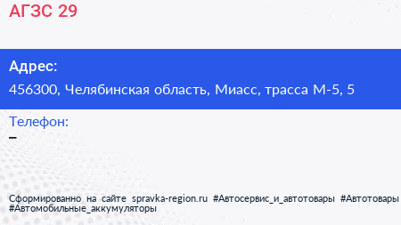 АГЗС-29 по адресу 456300, Челябинская область, Миасс, трасса М-5, 5 в дальнейшем Организация, размещена в следующих категориях: