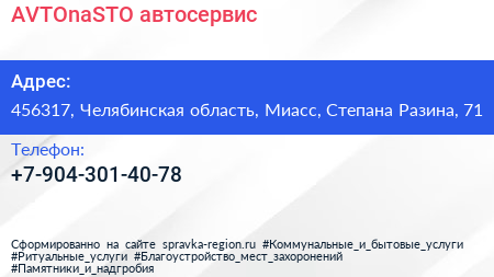 AVTOnaSTO, автосервис по адресу 456317, Челябинская область, Миасс, Степана Разина, 71 в дальнейшем Организация, размещена в следующих категориях: