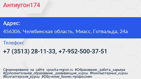 Антиугон174 по адресу 456306, Челябинская область, Миасс, Готвальда, 24а в дальнейшем Организация, размещена в следующих категориях: