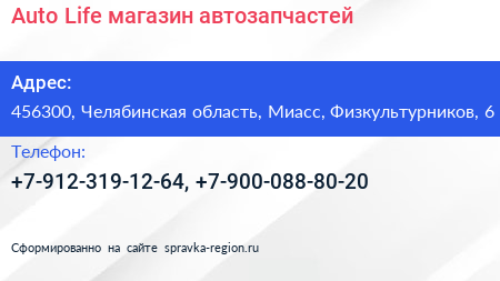 Auto Life, магазин автозапчастей по адресу 456300, Челябинская область, Миасс, Физкультурников, 6 в дальнейшем Организация, размещена в следующих категориях: