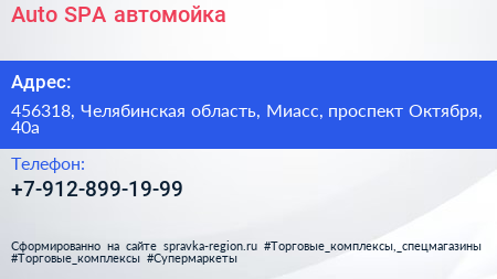 Auto SPA, автомойка по адресу 456318, Челябинская область, Миасс, проспект Октября, 40а в дальнейшем Организация, размещена в следующих категориях: