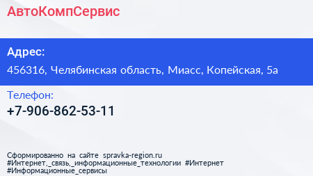 АвтоКомпСервис по адресу 456316, Челябинская область, Миасс, Копейская, 5а в дальнейшем Организация, размещена в следующих категориях: