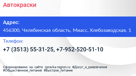 Автокраски по адресу 456300, Челябинская область, Миасс, Хлебозаводская, 1 в дальнейшем Организация, размещена в следующих категориях: