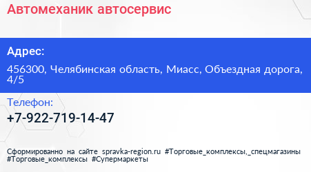Автомеханик, автосервис по адресу 456300, Челябинская область, Миасс, Объездная дорога, 4/5 в дальнейшем Организация, размещена в следующих категориях: