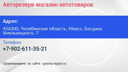 Авторезерв, магазин автотоваров по адресу 456300, Челябинская область, Миасс, Богдана Хмельницкого, 7 в дальнейшем Организация, размещена в следующих категориях: