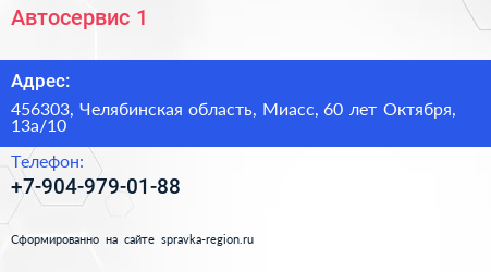 Автосервис №1 по адресу 456303, Челябинская область, Миасс, 60 лет Октября, 13а/10 в дальнейшем Организация, размещена в следующих категориях: