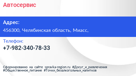 Автосервис по адресу 456300, Челябинская область, Миасс, в дальнейшем Организация, размещена в следующих категориях: