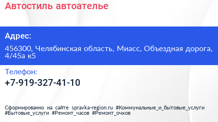 Автостиль, автоателье по адресу 456300, Челябинская область, Миасс, Объездная дорога, 4/45а к5 в дальнейшем Организация, размещена в следующих категориях: