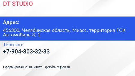 DT STUDIO по адресу 456300, Челябинская область, Миасс, территория ГСК Автомобиль-3, 1 в дальнейшем Организация, размещена в следующих категориях: