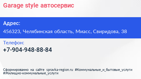 Garage style, автосервис по адресу 456323, Челябинская область, Миасс, Свиридова, 38 в дальнейшем Организация, размещена в следующих категориях: