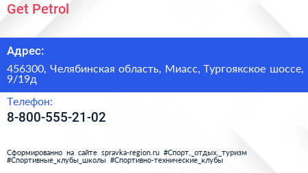 Get Petrol по адресу 456300, Челябинская область, Миасс, Тургоякское шоссе, 9/19д в дальнейшем Организация, размещена в следующих категориях: