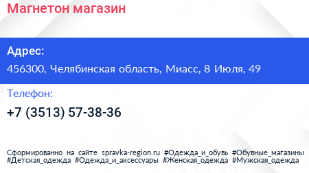 Магнетон, магазин по адресу 456300, Челябинская область, Миасс, 8 Июля, 49 в дальнейшем Организация, размещена в следующих категориях: