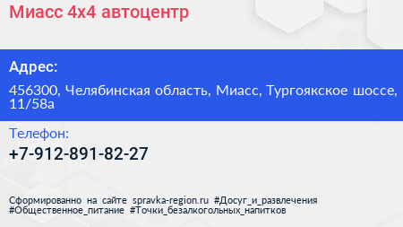 Миасс 4х4, автоцентр по адресу 456300, Челябинская область, Миасс, Тургоякское шоссе, 11/58а в дальнейшем Организация, размещена в следующих категориях: