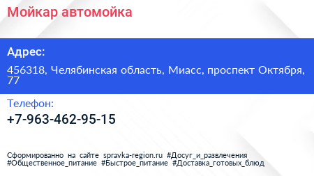 Мойкар, автомойка по адресу 456318, Челябинская область, Миасс, проспект Октября, 77 в дальнейшем Организация, размещена в следующих категориях: