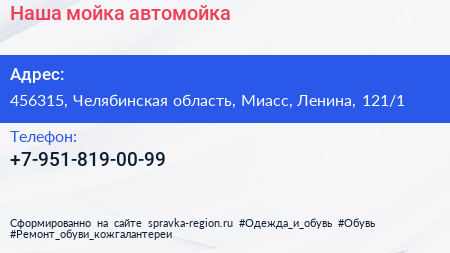 Наша мойка, автомойка по адресу 456315, Челябинская область, Миасс, Ленина, 121/1 в дальнейшем Организация, размещена в следующих категориях: