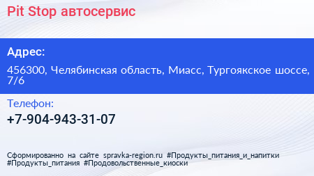 Pit Stop, автосервис по адресу 456300, Челябинская область, Миасс, Тургоякское шоссе, 7/6 в дальнейшем Организация, размещена в следующих категориях: