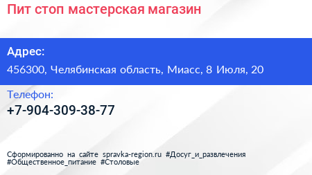 Пит-стоп, мастерская-магазин по адресу 456300, Челябинская область, Миасс, 8 Июля, 20 в дальнейшем Организация, размещена в следующих категориях: