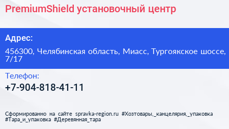 PremiumShield, установочный центр по адресу 456300, Челябинская область, Миасс, Тургоякское шоссе, 7/17 в дальнейшем Организация, размещена в следующих категориях: