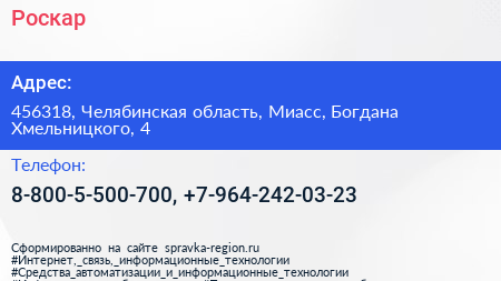 Роскар по адресу 456318, Челябинская область, Миасс, Богдана Хмельницкого, 4 в дальнейшем Организация, размещена в следующих категориях: