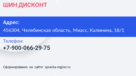 ШИН-ДИСКОНТ по адресу 456304, Челябинская область, Миасс, Калинина, 18/1 в дальнейшем Организация, размещена в следующих категориях: