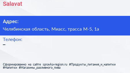 Salavat по адресу Челябинская область, Миасс, трасса М-5, 1а в дальнейшем Организация, размещена в следующих категориях: